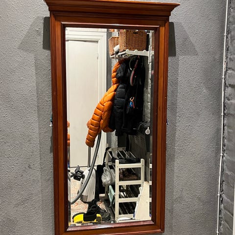 2 Antikk speil kommode/ sminkekommode med oval form og ramme i tre. Speilet har et dekorativt design med utskjæringer på sidene og en patina. Passer til bruk som entremøbel, sminkekommode i hjemmet eller som dekorativt element.