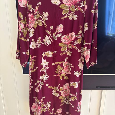 Stilig kjole i flotte tøffe farger ,bunnfarge burgunder med orange blomster ,fører seg elegant
