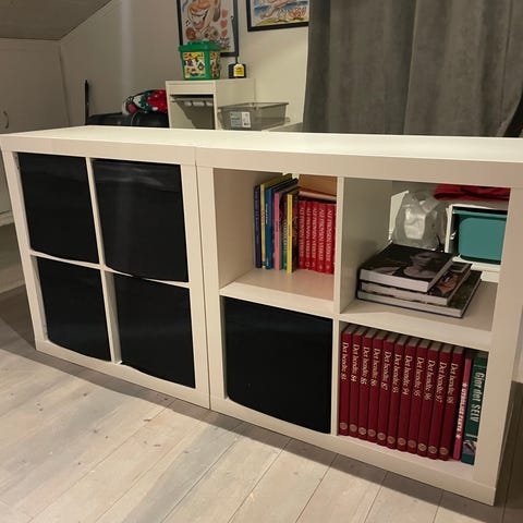 Har en svart Kallax hylle med 8 rom. Den er veldig ripete på den ene langsiden. Men den er hel, og funker som den skal. Passer nok best i en bod/kjeller/garasje. Evt et malingstrøk eller folie. Må hentes på Kapp.