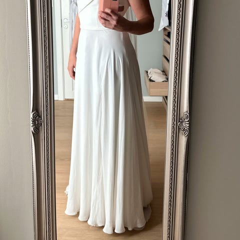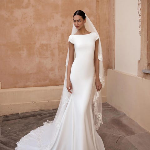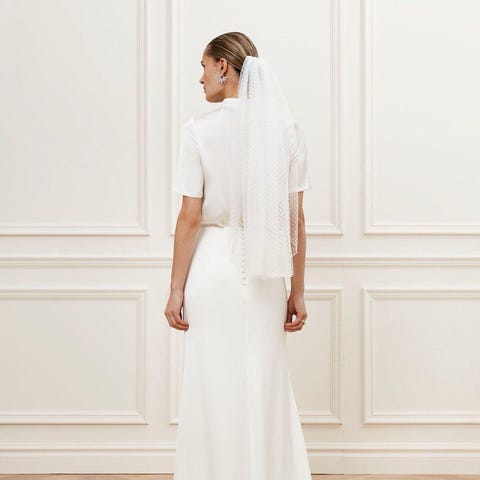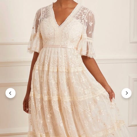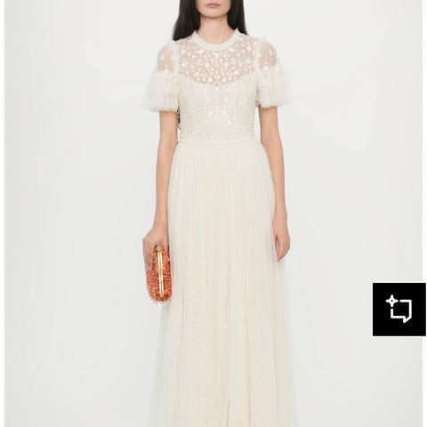 Modernising the clear vintage inspirations behind this dress, the Pennyflower gown from Needle & Thread features a V-neckline and back, while the reverse is accented by a simple tie fastening. Detailed with all-over lace embroidery that underlines the label’s feminine aesthetic, the flared crop sleeves add to the ethereal narrative that this piece truly deserves.