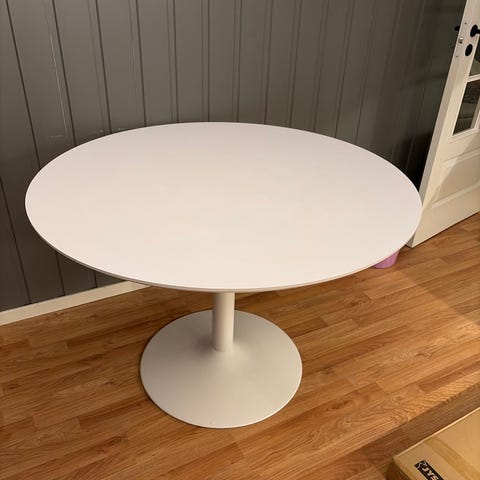 Rundt hvitt spisebord selges. Bordet er 75 cm høyt og har en diameter på 100 cm.