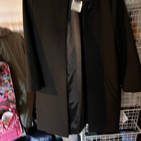 kåpe i størrelse 44 for kvinner. Kåpen er svart og laget av polyester.
