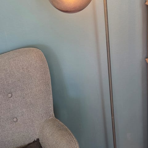 Lampene er ca 200 cm høy, har sort metallsokkel, krom stang og skjerm i plast.