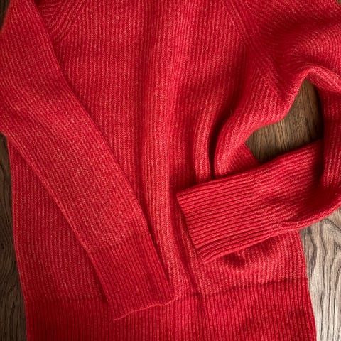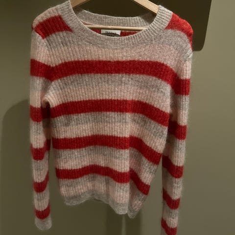 Skjønn soft genser ISABEL MARANT utført i 67% super kid mohair / 30% polyamide / 3% ull. 41 cm armhule til armhule, 68.5 cm. Ermer 67 cm fra skuldersøm og ut. Rød og hvit farge, lett puff øverst. Nypris kr 2000,- selges kr 900,- Genseren er merket fransk M som tilsvarer norsk small. Jeg kan sende.