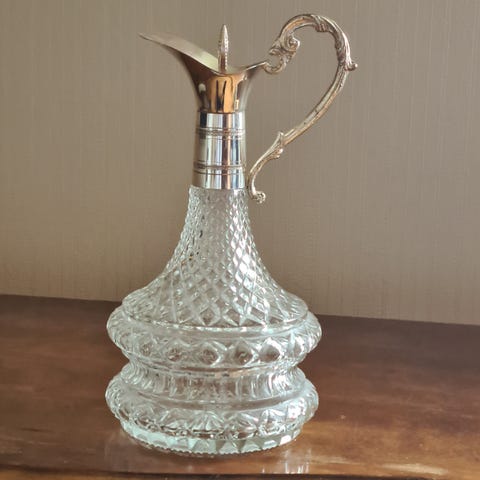 Selger en dekorativ karaffel laget av tykt, presset glass med diamantmønster. Den øvre delen – lokket og håndtaket – er laget av sølvfarget plast, designet for å se ut som metall. Karaffelen har et klassisk vintage uttrykk og passer både som bruksgjenstand og som dekor.
