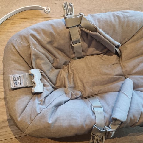 Veldig lite og godt brukt newborn sete fra Stokke til Tripp trapp stol med leketøyhenger. Uten flekker og nipper, fremstår som nytt.