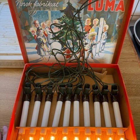 Små lys til å ha på bordet. Tipper fra 1950 1960 tallet. 7 lamper i grønt, gult og hvit. Ikke testet og er usikker om de virker. Ekstra pærer følger med