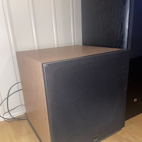 Center til venstre, 1/4 høyttalere høyre, basskasse under