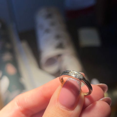 Selger en nydelig diamant ring i hvitt gull. Ringen har et moderne, kvadratisk design med mange små, glitrende steiner som gir et eksklusivt og luksuriøst uttrykk.