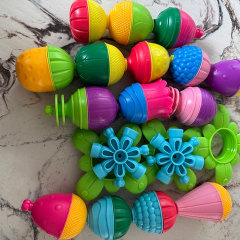 Barnleker Byggesett med fargerike deler i plast. Inkluderer ulike former og enheter som kan settes sammen for kreativ lek.