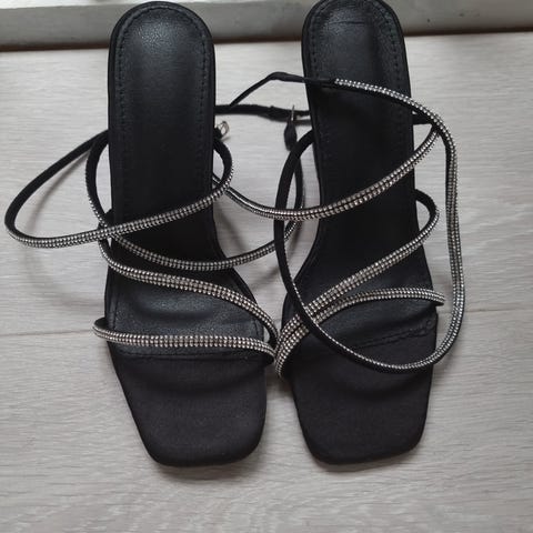 Heels i fin, skinnende sølvfarge. Dødslekker diamantpynt.