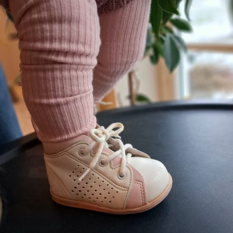 Søte lær å gå skinnsko med borrelås fra Pompom i lys brunrosa farge. Str 19