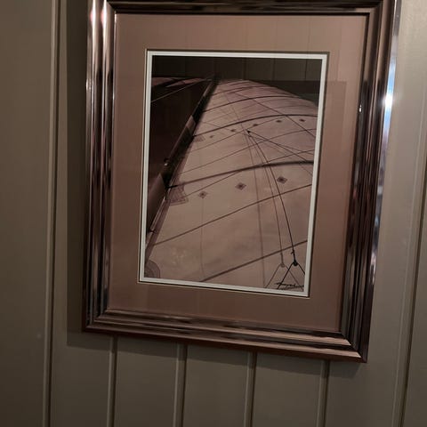 Hødnebø "Nautic". Innrammet tegning, signert. H=65 og B=53 cm. Maritimt miljø der tegningen viser detaljer av seil på en seilbåt, innrammet med metallramme. Passer til dekorasjon i hjem eller kontor.