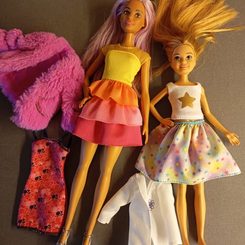 Dukke med kjole, smykkeskrin med speil, bukse og vest, turryggsekk/sovepose og kam.
