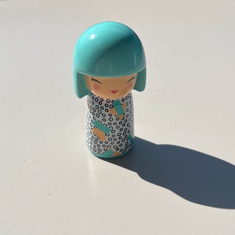 Ukjent merke punk rock kosedyr med lilla hud og grønt hår. Kosedyret har klær med svart vest, blå ermer og bukse, samt detaljer som skallemotiv på beltet. Passer som dekorasjon eller leketøy.