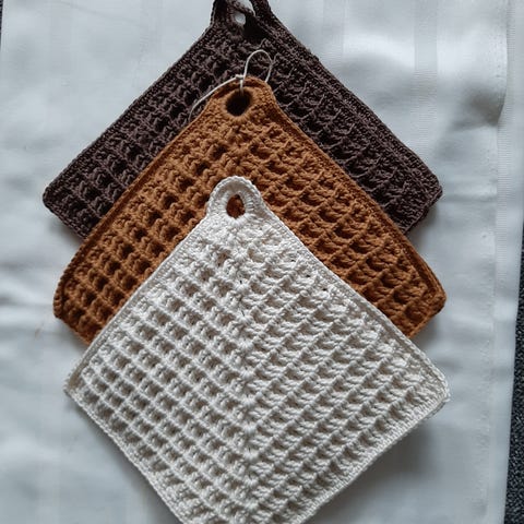Grytekluter 22 x 22 cm, tykke og gode. De er hakket, med garn som tåler 60 gr.