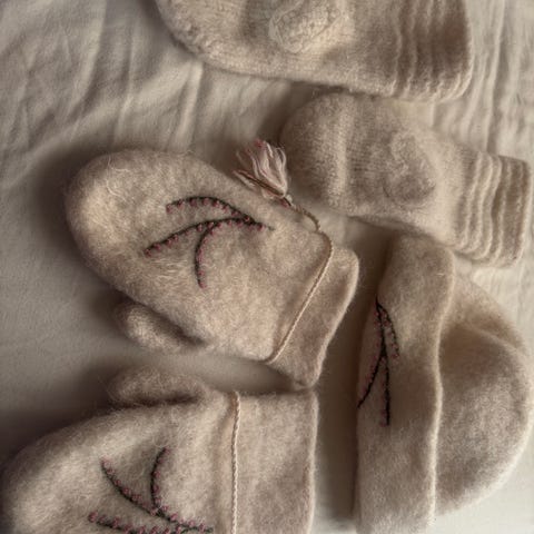 Nydelige røde votter og lue kjøpt på Telemarkstunet. Vottene er tovet.