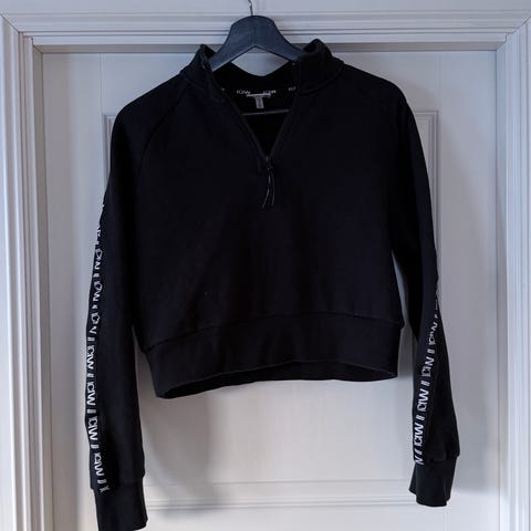 ICANIWILL Cropped hettegenser for dame i størrelse M. Passer like godt til hverdags/avslapning, som til trening. Genseren har hette med snorer og er i mørk farge. Genseren skulle visstnok være ny og ubrukt, men jeg synes at den ser noe brukt ut, og at fargen ser litt falmet ut, usikker på om dette skyldes bruk eller om det er sånn den skal se ut. Selges derfor billig. Fremstår liten i størrelsen, tilsvarer kanskje en S.
