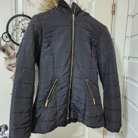H&M damejakke i størrelse M. Jakken er svart og laget av polyester. Den har glidelås foran, to lommer og hette. Super ytterjakke høst og vår, til trening eller som mellomlag under vindtett jakke.