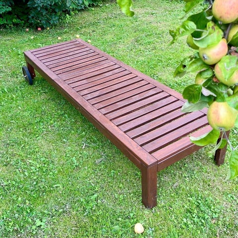Sofa/krakk i tre med tilhørende puter. Den er beiset i en sennepsgul farge. (se bilde nr. 2)