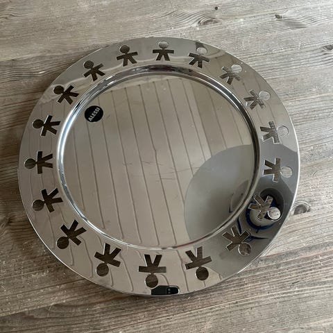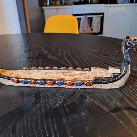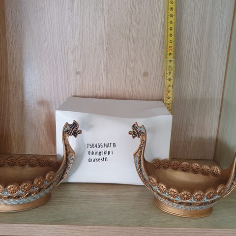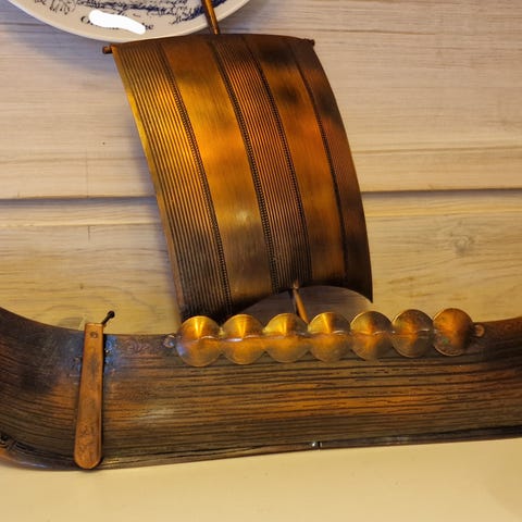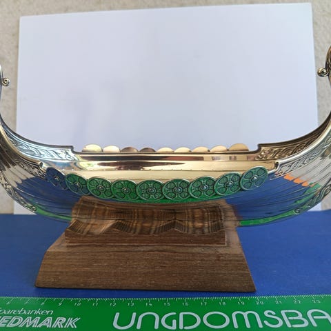 Selger en flott serviettholder vikingskip. Jeg har aldrig funnet ut hva den er laget av, jeg har pusset den blank med sølvpuss men har aldrig funnet noen stempler!