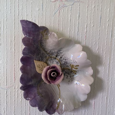 Det er også dekorert med flotte detaljer i metall. Fordypning midt i fatet med insatt metall dekor med forseggjort mønster.