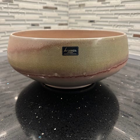 Dekorativ okseblodfarget bolle fra kjente Lannem keramikk i Rakkestad.Fra ca.1980.Meget god stand.Diameter 16 cm.Høyde 8,5cm.