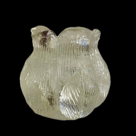 Frosk (eller padde?) i klart kunstglass fra Hadeland glassverk. Klistremerke under. Til pynt eller bruk som Brevpresse. Brevvekt.