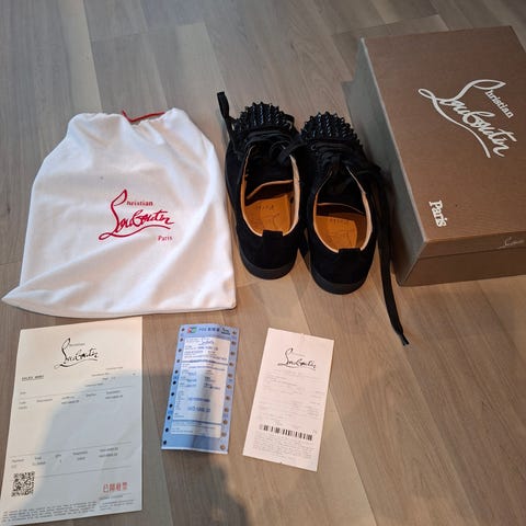 Christian Louboutin Louis Junior Spikes Flat sneakers joggesko i størrelse 40. Skoene er svarte med spikerdetaljer på tuppen. Laget av skinn og annet materiale. Designet for menn.