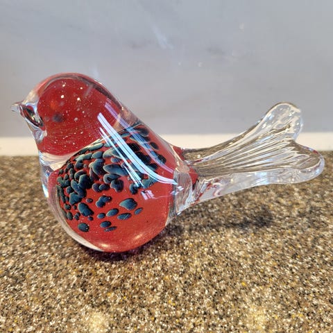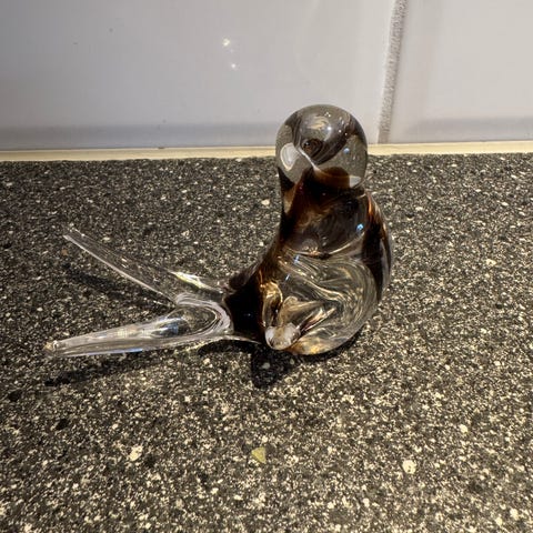 Den minste er litt annerledes, med mer uttalte og noe mer regelmessige bobler innvendig. Ukjent opphav . Figuren er mer oppreist. Lengde 6 cm. Høyde 6,5 cm. Vingespenn 7,1 cm. Ingen skader. 100kr