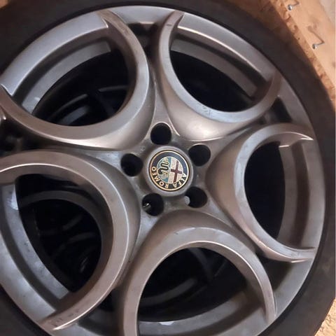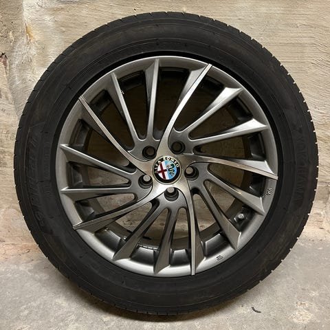 Felgene er stilige originale Alfa TI felger, men er litt slitt. Et av dekkene har en flenge og må skiftes, de andre tre er muligens brukbare