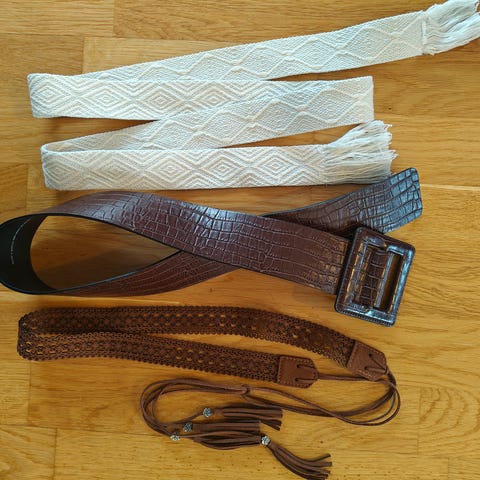 Unisex belte i hvit lær med brune slangedetaljer og spenne formet som et slangehode. Belte har flere hull for justering av størrelse og kombinerer funksjon med dekorative elementer.