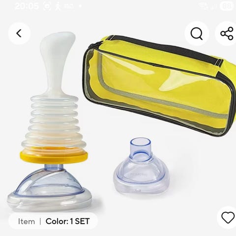 Choking Rescue Device nødredningsapparat med blå og gul farge. En mekanisk enhet designet for å hjelpe ved kvelning ved å fjerne fremmedlegemer fra luftveiene. Leveres med flere munnstykker og instruksjoner for bruk i nødsituasjoner.
