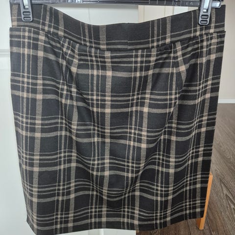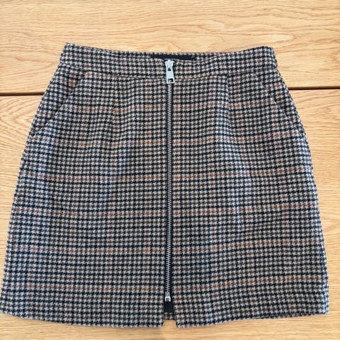 «Dette rutete miniskjørtet har en flagrende passform. Det har en skjult lukking med hekte og glidelås på siden og en foring.»