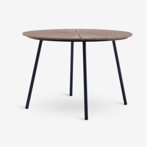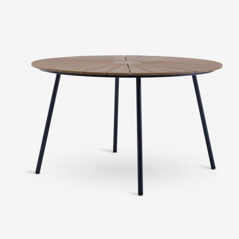 Tekst fra Jysk: Rundt hagebord med bordplate i kunsttre. Svart ramme og ben i pulverlakkert aluminium. Kunsttre har utseende og tekstur som naturlig tre uten behov for vedlikehold. Aluminium er et lett og robust materiale som ikke ruster. Ø110 x H74 cm
