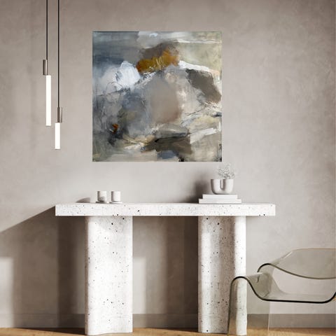 Abstrakt kunstmaleri med dominans av brune og blå nyanser. Maleriet har en teksturert overflate og viser et samspill av farger og former i et moderne uttrykk. Passer til dekorasjon i stue, kontor eller andre oppholdsrom.