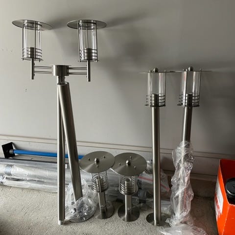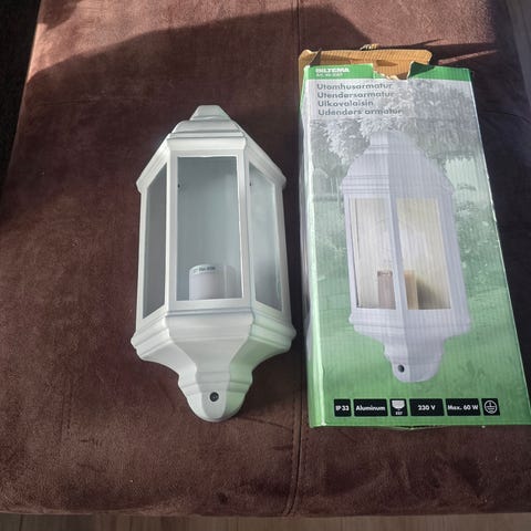 Mega tower R Utebelysning i metall med glass. To søyler og to vegglamper med beskyttende gitter. Egnet for utendørs bruk.