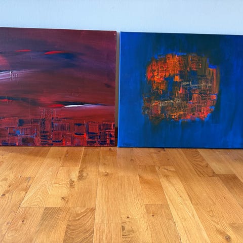 To malerier med abstrakt motiv i lilla og svart farger. Maleriene er på lerret og signert. Passer til dekorasjon i hjem eller kontor.