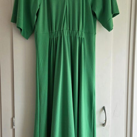 Knelang kjole med V-hals, korte ermer og splitt bak. Skjult glidelås i ryggen og normal passform. Egnet for både arbeid og penere bruk.
