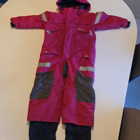 Genial vinterdress med smart løsning for å feste votter (se bilde). Reflekser som gjør at barnet er synlig og gode fotstrikker og hette. Den er godt brukt, men ingen hull eller annet sjenerende. Det er en søm som kan rekkes opp, slik at den kan legges ut til en større størrelse. Se bilde. Nyvasket av meg med impregneringsvask.