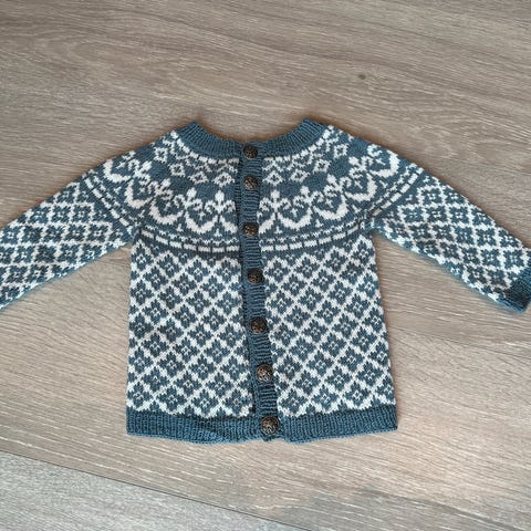 Herlig kofte med fine knapper i ca str 80. Strikket i ull/ullmiks. Ørliten formørkning på ene rose oppe på venstre skulder, se bilde 3. Se også gjerne mine andre annonser med barneklær. Sendes eller hentes