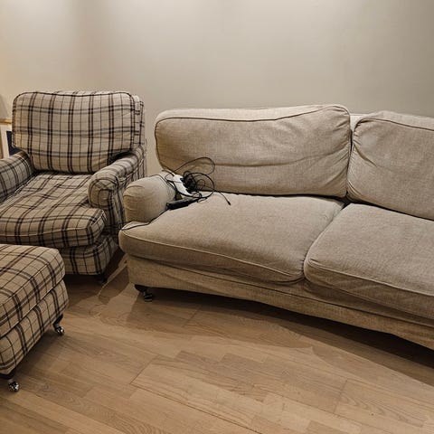 Queen Anne stol, wingback stol, Englesson stil, Englesson lenestol, britisk lenestol, ottoman, puff, fotpall, klassisk stol, vintage lenestol, 80-talls lenestol, 90-talls lenestol, traditional armchair, English country style, cottagecore møbler, bibliotekstol, lesekrok stol, House & Garden style, comfortable armchair, high back chair, stofftrukket stol, håndverksmøbel, kvalitetsmøbler, britisk design, sofa og stol, lenestol med puff, interior design, timeless chair, ørelappstol