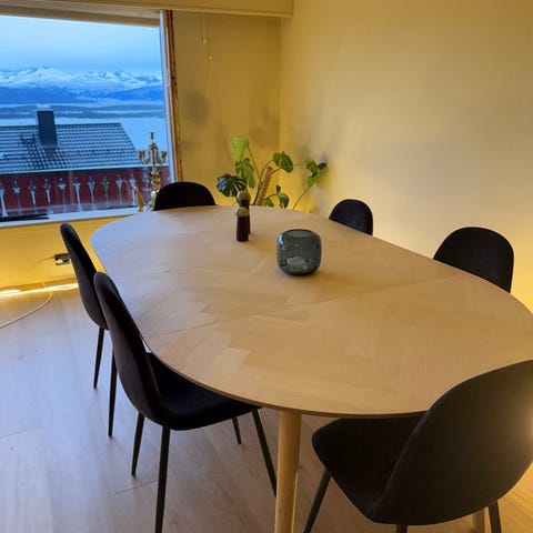 Solid, rundt spisebord i massivt tre med sorte stålbein fra Bohus. Kjøpt i 2021. Plass til 6 personer. Noe vanlig bruksslitasje-lite synlig (se bilder).