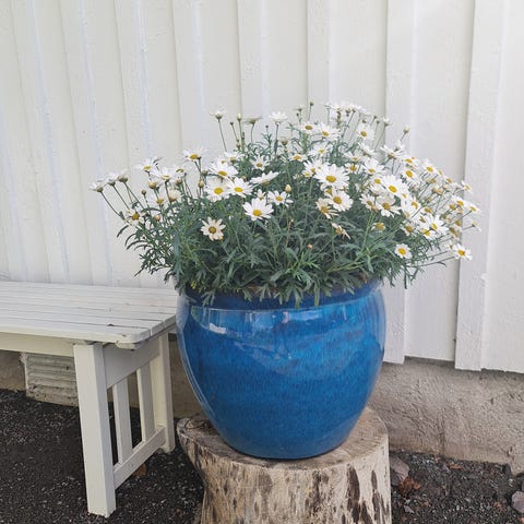 Stor potte med mørkeblå glassur. Noen bruksmerker med inge skader/sprekker. Den er til utebruk, men hadde den aldri ute om vinteren, så er litt usikkert om den tåler frost. H 29cm Ø38(inne)-45cm.