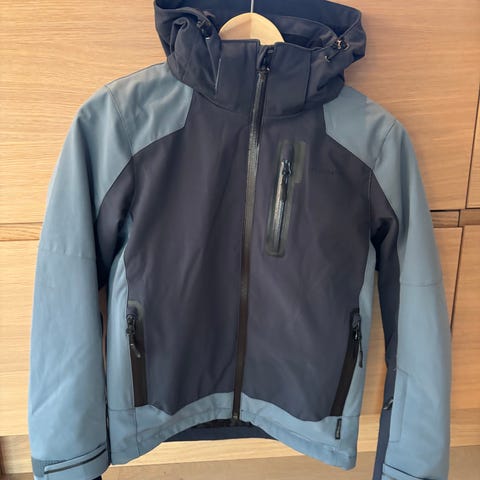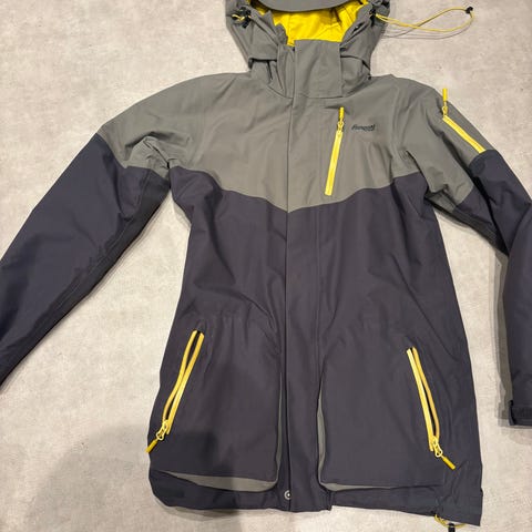 Brukt, men pen goretex jakke fra Bergans str 164 selges for kr 300. Flott jakke med god justering i bol, ermer og god hette med brem. Mørk blå, med lysere blå og orange detaljer.