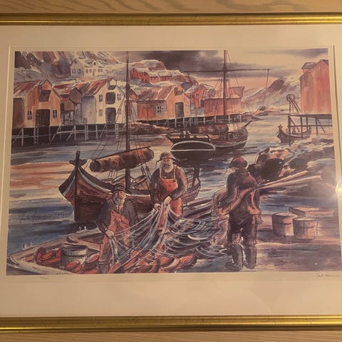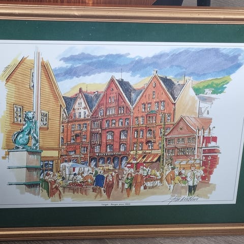 Pent innrammet bilde av Hetlands berømte bilde «Springflo på Bryggen» Bildet måler 63 cm x 60 cm.