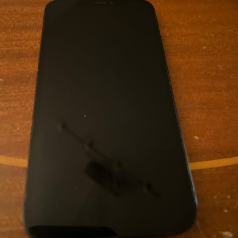Apple iPhone 12 med 64 GB lagringskapasitet i svart farge. Telefonen har en 6,1-tommers Super Retina XDR-skjerm og er laget med keramisk skjold for bedre holdbarhet. Enheten støtter 5G-nettverk og har dobbelt 12 MP kameraoppsett. Batteriets helsetilstand viser 100 % kapasitet.