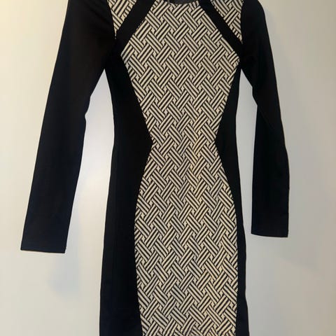 H&M festkjole i størrelse 34, svart farge og laget av viskose materiale. Kjolen har en klassisk krage, knappedetaljer og glidelås foran. Den justeres alt etter som hvor åpen man vil ha den fremme. Tettsittende og til knærne. Veldig fin kjole, dessverre blitt for liten for meg.