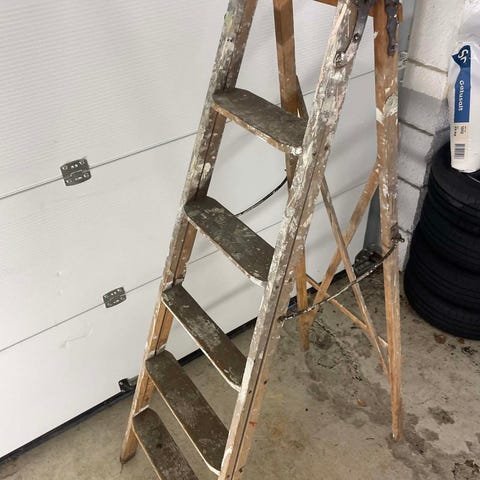 Tretrappestige laget i tre, med flere trinn. En eldre og meget robust stige. Egnet for bruk i hjemmet eller på arbeidsplassen for å nå høyere områder. Enkel konstruksjon med stiger av tre.