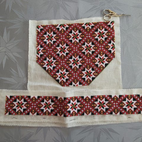 Dette har opptegnet en del av Mønsteret med påskriften bak hvor mange spisser for mansjetter, bryst og halslinning for skjorte til beltestakk. Inneholder tekst med farger som er brukt nettopp på denne bunadskjorten, men det kan jo endres hva man ønsker. Legger ved en side med beskrivelse av og historien om Beltestakken og hva som skal medfølge denne.